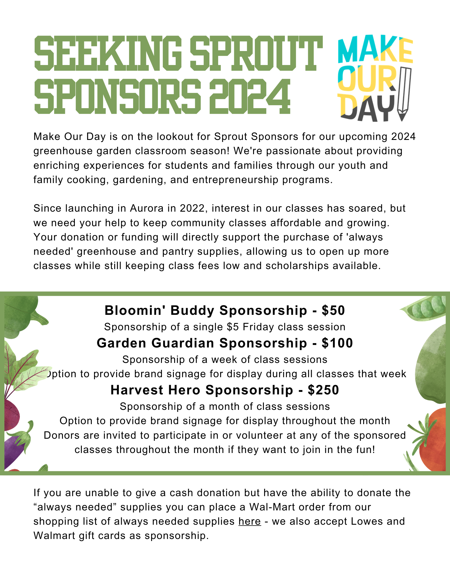 If improving children’s mental health and boosting their confidence through building their competence is important to you, I hope you’ll look at our 2024 Sprout Sponsorship Program and talk with your club, group, church, family, or workplace about sponsoring a day, week, or month of Cooking and Gardening classes at the Make Our Day Garden Classroom in Aurora!