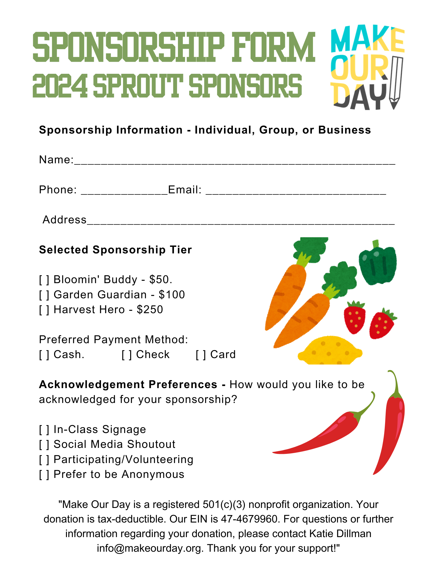 - For businesses or groups who would like to arrange for social media shoutouts, classroom signage, or an in-person donation delivery – Fill out this online sponsorship form OR Print this PDF Form and email or mail it back to info@makeourday.org / 516 S Carnation Dr Aurora, MO 65605